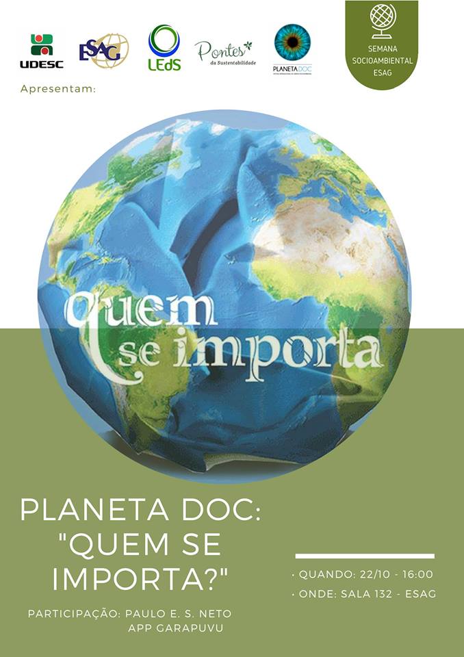 No dia 22/10 a Semana Socioambiental da ESAG irá apresentar o documentário do Planeta.Doc “Quem se Importa?”. Após a exibição do documentário uma roda de conversa sobre a temática irá ocorrer entre os participantes e o convidado Paulo Neto do Aplicativo Garapuvu. 22/10/18 – 16:00 – Sala 132 – Responsável: Professora Graziela Alperstedt