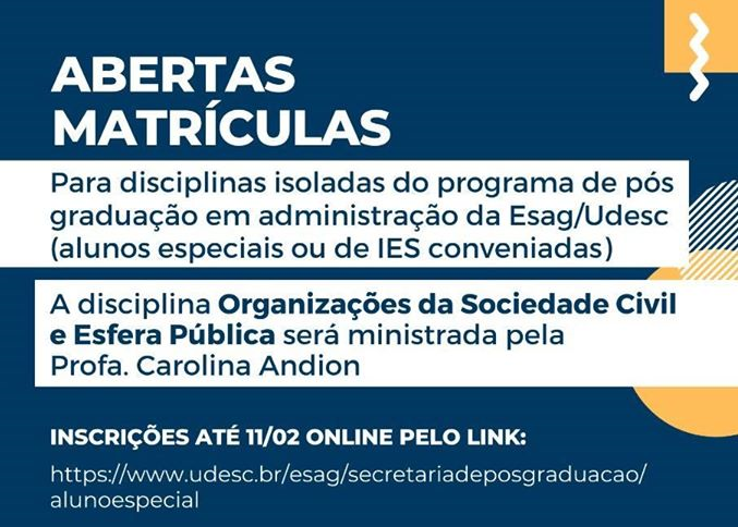 Abertas matrículas para disciplinas isoladas do programa de pós graduação em administração da Esag/Udesc!