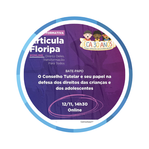No próximo dia 12 de novembro de 2020, das 14h30min às 17h, será realizado o 9º encontro da Jornada Formativa Articula Floripa. O encontro virtual será um bate-papo com o tema: “O Conselho Tutelar e seu papel na defesa dos direitos das crianças e dos adolescentes”, sendo aberto aos diferentes atores do Sistema de Garantia dos Direitos da Criança e do Adolescente (SGDCA).