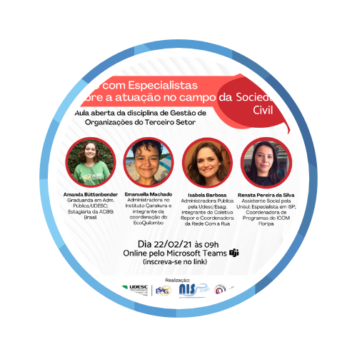 No próximo dia 22 de fevereiro de 2021, das 09h às 12h, será realizado o Papo com Especialistas sobre a atuação no campo da Sociedade Civil. A atividade será realizada como uma Aula Aberta da disciplina de Gestão de Organizações do Terceiro Setor, do sexto termo do Curso de Administração Pública da Udesc/Esag, que é ministrada pela professora Dra Carolina Andion, que também é coordenadora do Núcleo de Inovações Sociais na Esfera Pública (NISP).