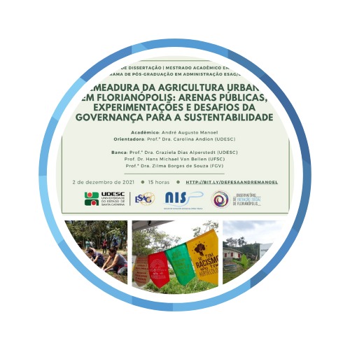 No próximo dia 02 de dezembro de 2021, a partir das 15h, o mestrando André Manoel, do Programa de Pós-Graduação em Administração (PPGA), da Esag/Udesc, defenderá a sua dissertação com o título: “Semeadura da agricultura urbana em Florianópolis: arenas públicas, experimentações e desafios da governança para a sustentabilidade”.
