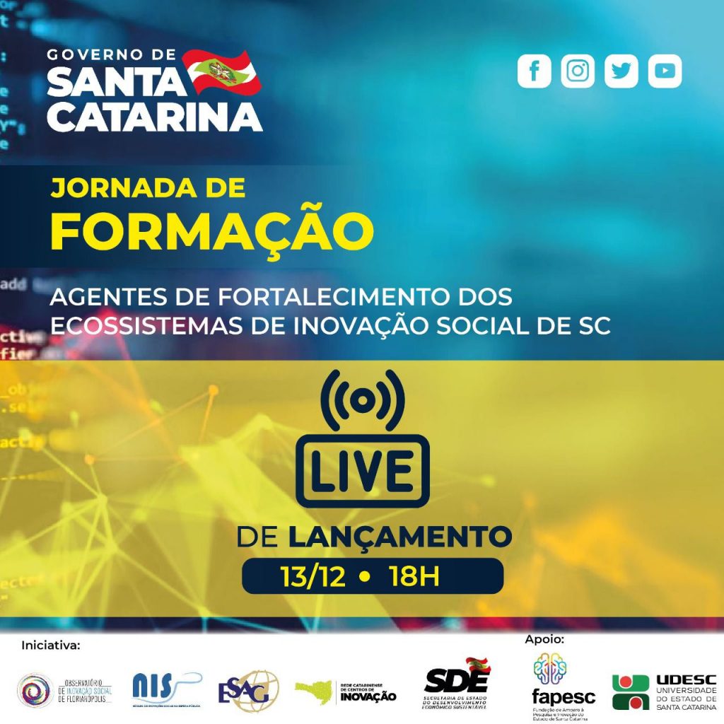 Na live será apresentada a chamada para inscrição na “Jornada Formativa de capacitação para agentes dos Ecossistemas de Inovação Social nas regiões catarinenses”. O intuito da Jornada é favorecer a inserção comunitária dos Centros de Inovação de Santa Catarina (CIs), por meio de formação, sensibilização e engajamento das equipes dos CIs em relação à inovação social, capacitando-os para reconhecer e fortalecer os Ecossistemas de Inovação Social nas regiões em que atuam.