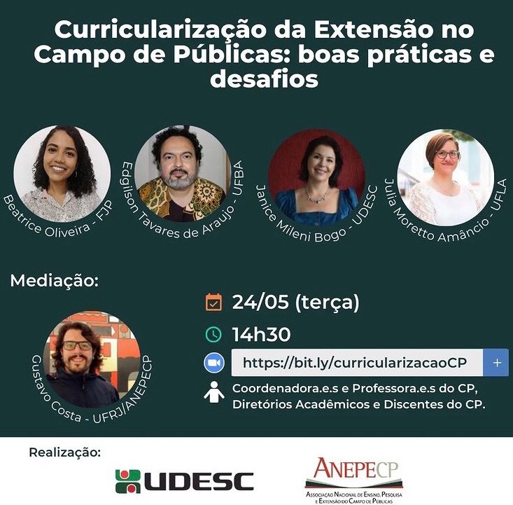 ▶️ Os Departamentos de Administração Pública e de Governança Pública da UDESC em parceria com a ANEPECP promovem o webnário “Curricularização da Extensão no Campo de Públicas: experiências, boas práticas e desafios”. O evento tem por objetivo colocar em debate as estratégias empregadas para a integração da extensão à matriz curricular e às atividades de pesquisa no Campo de Pública (CP), assim como ampliar e fortalecer os diálogos em torno da temática. O evento contará com a participação de Beatrice Oliveira (FJP), Julia Moretto Amâncio (UFLA), Edgilson Tavares de Araujo (UFBA) e Janice Mileni Bogo (UDESC) e a mediação de Gustavo Costa (UFRJ/ANEPECP). Convidamos toda comunidade do campo para esse importante diálogo!