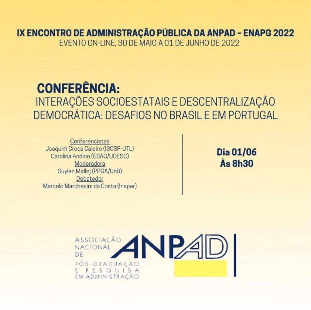 No dia 01 de junho, às 08h30, a professora Carolina Andion irá participar do IX ENAPG como conferencista na seguinte temática: Interações socioestatais e descentralização democrática: desafios no Brasil e em Portugal.