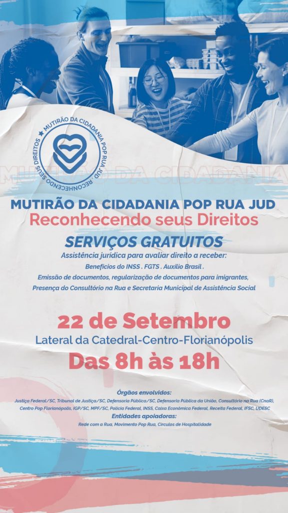 No dia 22 de setembro, das 08h às 18h00, ocorrerá o “Mutirão da Cidadania Pop Rua Jud – Reconhecendo seus direitos” na Lateral da Catedral, no centro de Florianópolis.