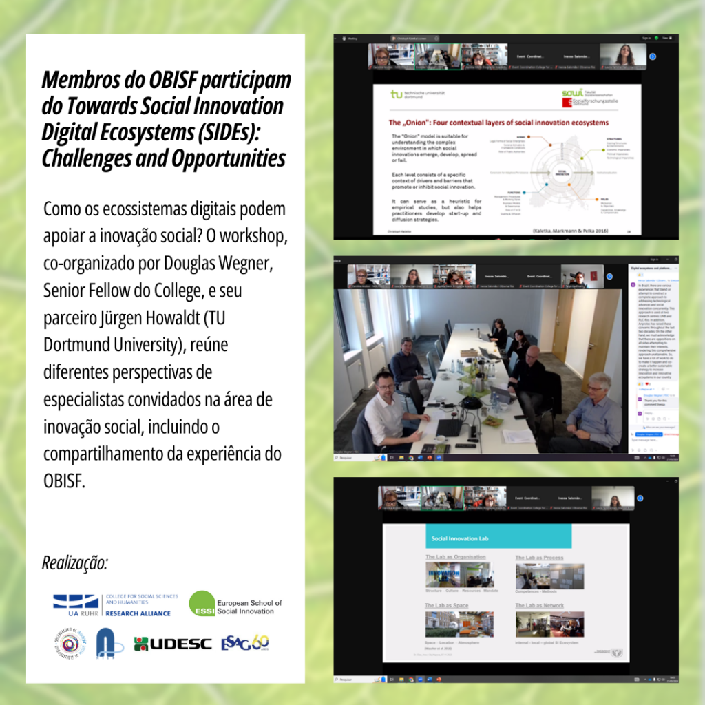 No dia 21 de maio, o OBISF, representado pela coordenadora e professora da UDESC/ESAG, Carolina Andion, participou do workshop “Towards Social Innovation Digital Ecosystems (SIDEs): Challenges and Opportunities”, realizado em Essen, na College for Social Sciences and Humanities, em formato híbrido, compartilhando a experiência do OBISF como plataforma digital colaborativa de inovação social. O evento foi co-organizado por Douglas Wegner, Senior Fellow na College, e Jürgen Howaldt, da TU Dortmund University, e reuniu especialistas na área de inovação social para discutir os fatores de sucesso, desafios e oportunidades dos ecossistemas digitais de inovação social.