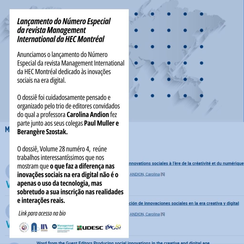 Gratos ao anunciar o lançamento do Número Especial da revista Management International (Mi) da HEC Montréal dedicado às inovações sociais na era digital (Volume 8, n°4). A Mi é uma revista independente que publica artigos de alta qualidade em francês, inglês e espanhol sobre administração internacional. A revista incentiva o debate científico, apoia jovens pesquisadores e valoriza diversas perspectivas de pesquisa.