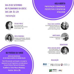 Na próxima sexta, dia 20, das 10h às 12h, teremos uma aula aberta com o tema: Participação e democracia: perspectivas e desafios na atualidade. Na ocasião teremos a presença da profa. Paula Chies Schommer traçando um panorama internacional sobre o tema, Suylan Midlej da UNB trazendo um panorama nacional, Cíntia Mendonça e André Manoel com […]