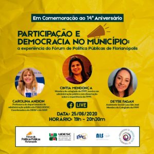O Núcleo de Inovações Sociais na Esfera Pública (NISP), por meio do Observatório de Inovação social de Florianópolis (OBISF), tem a satisfação em divulgar o vídeo pesquisa da Cíntia Mendonça, pesquisadora do OBISF, Mestre em Administração na ESAG/UDESC, e que é membra do colegiado do FPPF e participou da live apresentando os resultados de sua pesquisa de mestrado.