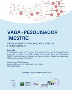 O Observatório de Inovação de Florianópolis está com vaga aberta para bolsista com o título de mestre para atuar no Programa INSPIRE. O INSPIRE é um programa estadual de co-construção de conhecimento, formação e fomento à inovação social, fruto de um projeto de pesquisa aplicada realizado através de parceria do Observatório de Inovação Social de […]